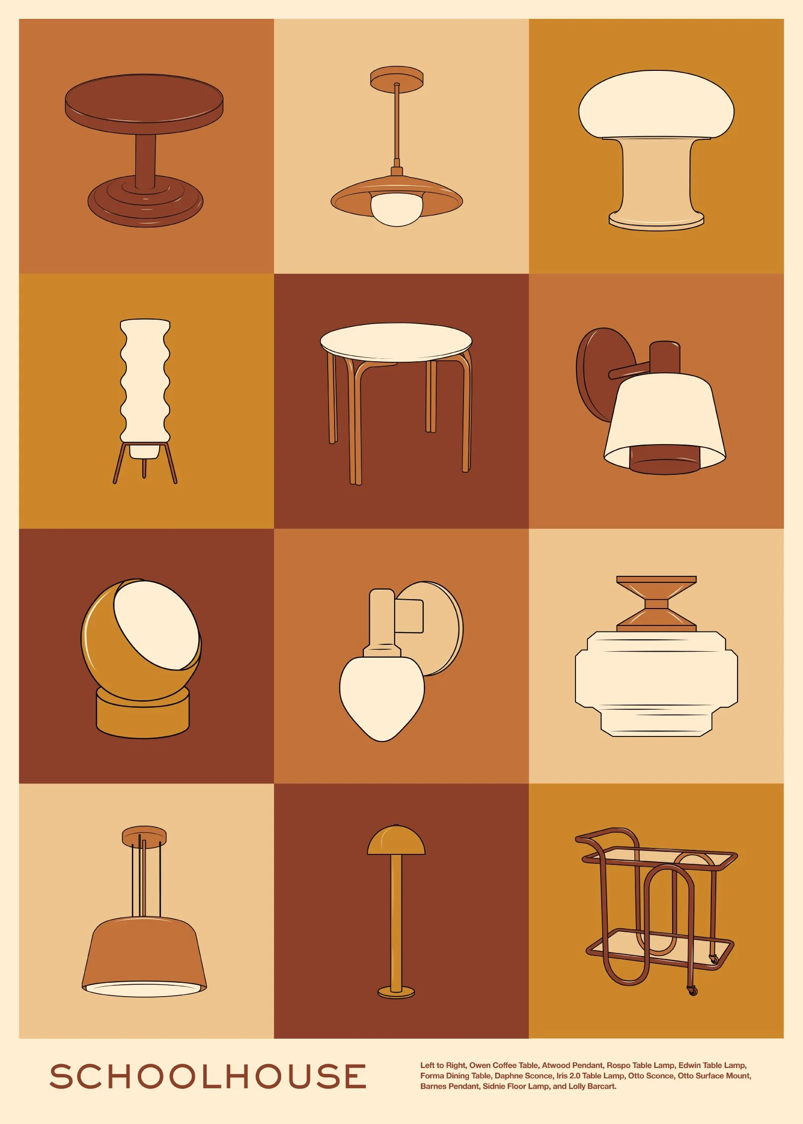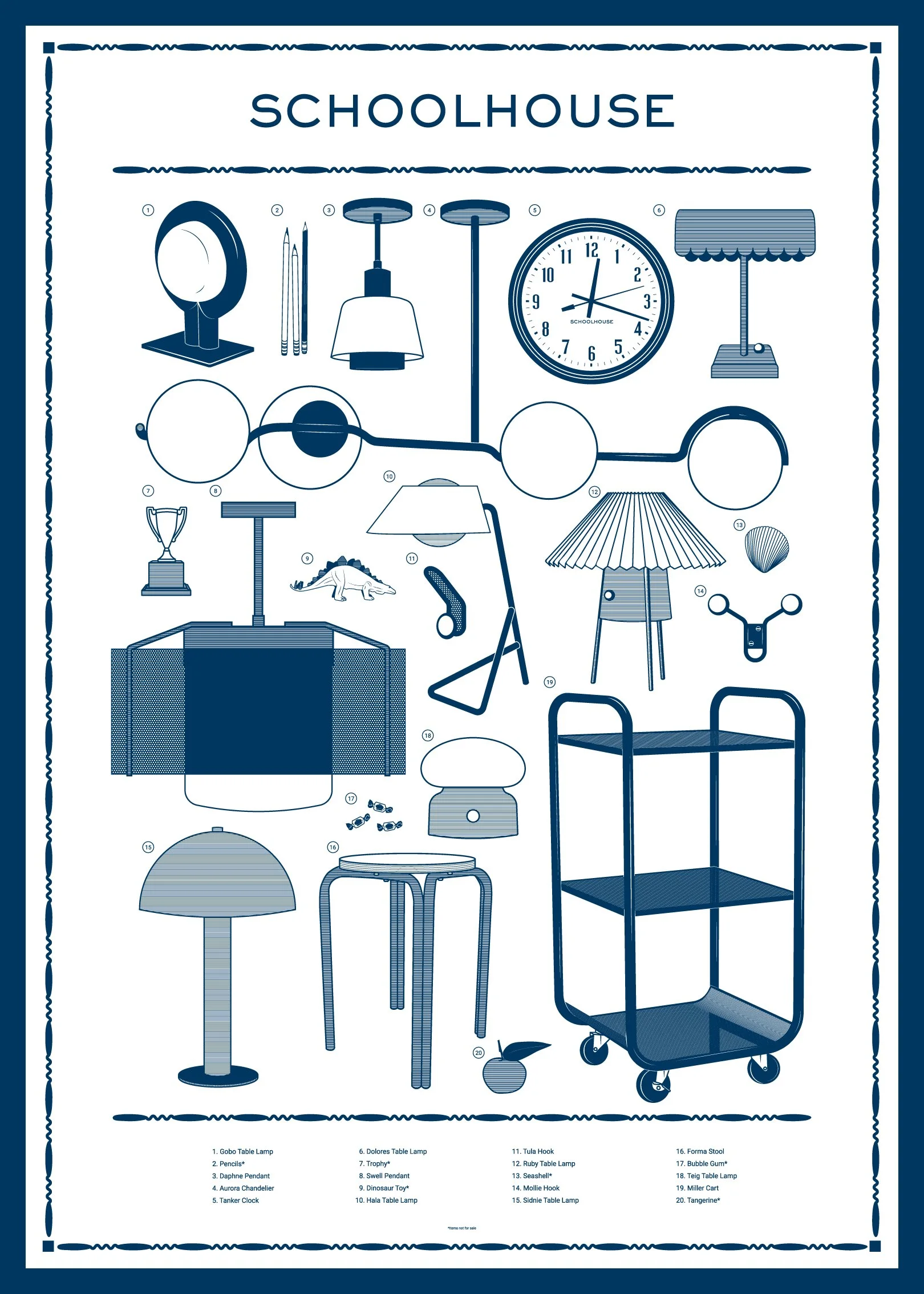 This calendar is inspired by collection, and archiving I illustrated both Schoolhouse products both new and iconic along side small chotskies that the brand often uses in visual styling creating an eclectic mix of new and old.